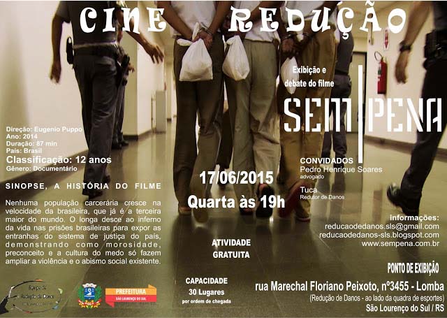 O documentário “Sem Pena”, dirigido por Eugênio Puppo, é tema do Cine Redução e de uma roda de conversa sobre o sistema carcerário brasileiro e a justiça no país. O longa apresenta as condições da população carcerária do país, a terceira maior do mundo, e demonstra a morosidade, o preconceito e a cultura do medo que ampliam a violência e o abismo social existente. A atividade será realizada na quarta-feira (17), a partir das 19 horas, no espaço “Que Lugar é Esse?” localizado na Rua Marechal Floriano Peixoto, 3.455.